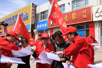 中石油管道公司長慶輸油氣分公司管轄的管道途徑陜甘寧蒙地區(qū),有近千公里,在管道保護工作中,他們利用一切時機,加大管道法宣傳。圖為在甘肅環(huán)縣山城鎮(zhèn)集市開展管道宣傳活動,工作人員將印有管道法宣傳單和舉報電話的宣傳品送給當?shù)匕傩铡?
