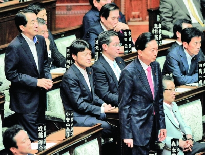 6月26日,在位于東京的日本國(guó)會(huì)眾議院,日本前首相鳩山由紀(jì)夫(右一)排隊(duì)準(zhǔn)備對(duì)消費(fèi)稅增稅法案投反對(duì)票。