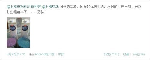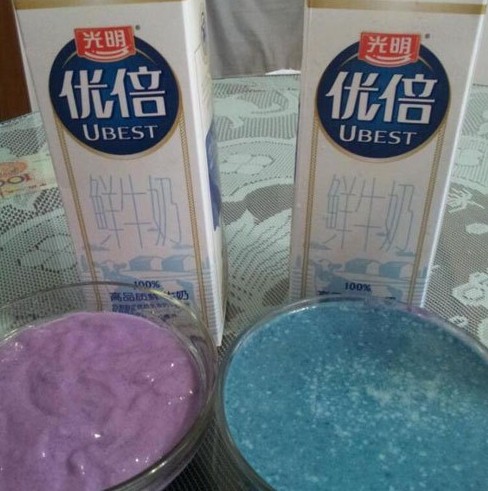 6月27日,網(wǎng)友Josphin在微博爆料稱,用光明優(yōu)倍牛奶調(diào)出的紫薯呈現(xiàn)出藍(lán)色,懷疑牛奶存在質(zhì)量問題,“同樣的紫薯,同樣的優(yōu)倍牛奶,不同的生產(chǎn)日期,居然打出撞色來了”。