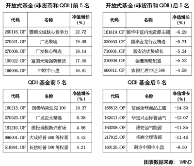 從具體基金產(chǎn)品來看,在普通股票型基金中,景順長(zhǎng)城核心競(jìng)爭(zhēng)力(22.72%)、廣發(fā)聚瑞(19.66%)、廣發(fā)核心精選(18.14%)業(yè)績(jī)位居前三;在指數(shù)型基金中國投瑞銀滬深300金融(9.87%)、富國中證500(9.66%)、博時(shí)超大盤ETF(9.04%)位居前三;混合型基金中富國天瑞強(qiáng)勢(shì)精選(17.50%)、中銀收益(15.65%)、交銀主題優(yōu)選(12.98%)表現(xiàn)最好;萬家添利分級(jí)(13.77%)、天治穩(wěn)健雙盈(12.96%)、南方廣利回報(bào)AB(10.96%)位居全部債券型基金業(yè)績(jī)前三。