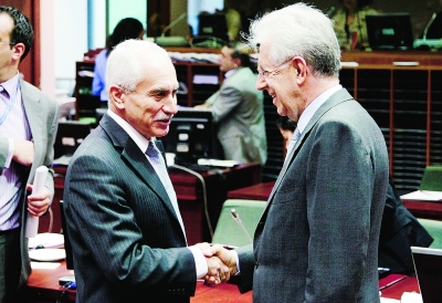 圖為意大利總理(兼任財長)馬里奧·蒙蒂(右)與塞浦路斯財長希亞爾利在會場握手交談。