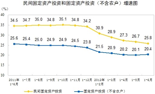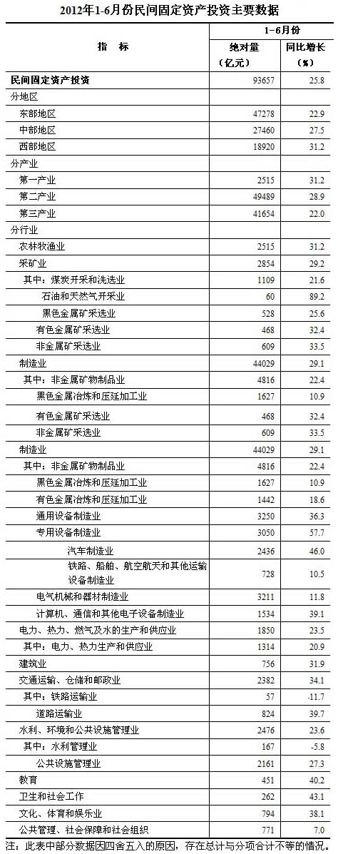 2012年1-6月份,全國民間固定資產投資93657億元,同比名義增長25.8%(扣除價格因素實際增長23.3%),增速比1-5月份回落0.9個百分點。民間固定資產投資占固定資產投資的比重為62.1%,比1-5月份回落0.1個百分點。