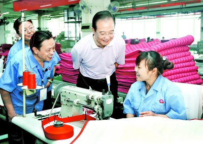7月13日至15日,中共中央政治局常委、國務院總理溫家寶到四川省成都市就當前經濟形勢進行調研,并在成都主持召開河南、湖南、廣西、四川、陜西五省區(qū)經濟形勢座談會。這是7月14日,溫家寶在彩虹電器集團公司生產車間與工人交談。