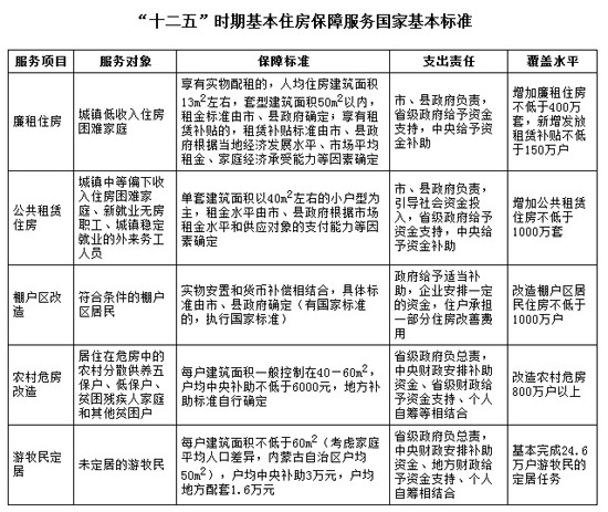 加快建立健全基本住房保障服務(wù)國家標(biāo)準(zhǔn)體系。依據(jù)基本住房保障有關(guān)政策規(guī)定,為保證保障性住房的供給規(guī)模和質(zhì)量,明確工作任務(wù)的事權(quán)與支出責(zé)任,制定“十二五”時期基本住房保障服務(wù)國家基本標(biāo)準(zhǔn)。