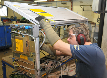 庫薩科斯基公司黑諾拉回收處理廠預(yù)處理車間的工人在拆卸廢棄的電子設(shè)備。 |