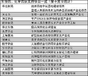 而對于通用名化學(xué)藥項目,則主要支持企業(yè)仿制生產(chǎn)新到期專利藥物,建立藥品標(biāo)準(zhǔn)品庫和微量雜質(zhì)標(biāo)準(zhǔn)品庫等基礎(chǔ)性平臺,擬扶持一批制劑國際化能力建設(shè)項目,將涉及十幾家企業(yè)。促進擴大制劑在國際主流市場,特別是歐美日等發(fā)達國家市場的份額。根據(jù)最新名單,此次共34家企業(yè)項目獲支持,其中,涉及上市公司包括亞寶藥業(yè)、美羅藥業(yè)、上海醫(yī)藥、健康元等。