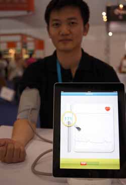 日前,蘋果產(chǎn)業(yè)鏈大會——Macworld | iWorld 2012數(shù)字亞洲博覽會在京舉行。記者發(fā)現(xiàn),與會中國企業(yè)大多處于利潤空間較小的產(chǎn)業(yè)鏈下游。而業(yè)界人士指出,中國企業(yè)有望借助移動互聯(lián)網(wǎng)的飛速發(fā)展,在蘋果產(chǎn)業(yè)鏈中獲得更高利潤,甚至顛覆整個產(chǎn)業(yè)鏈。圖為工作人員展示九安醫(yī)療電子股份有限公司開發(fā)的“移動互聯(lián)血壓計(jì)”。