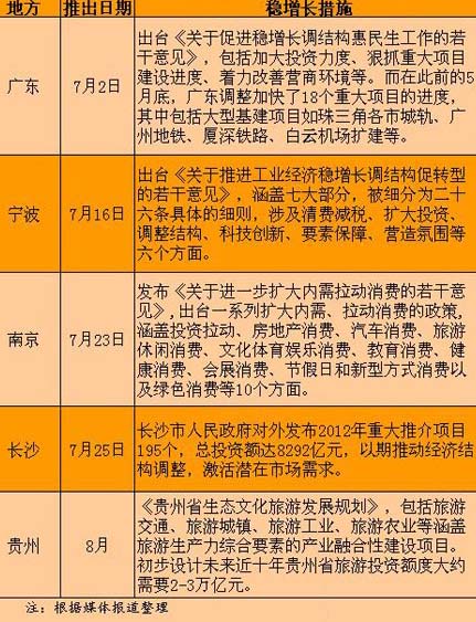 除了中央投資力度不斷增長外,各地也陸續(xù)出臺各種政策,增加投資規(guī)模。中新網(wǎng)財經頻道統(tǒng)計發(fā)現(xiàn),7月以來,廣東、寧波、南京、長沙、貴州等多個省市出臺穩(wěn)增長若干措施,拉開地方穩(wěn)增長大幕。