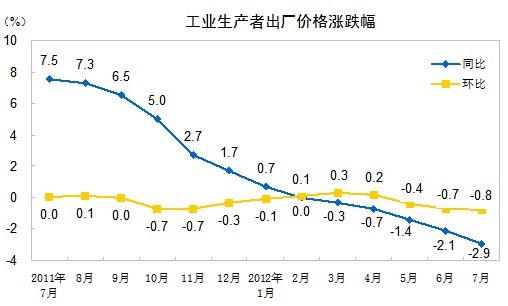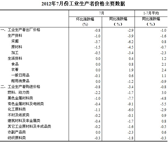 2012年7月份,全國工業(yè)生產(chǎn)者出廠價格同比下降2.9%,環(huán)比下降0.8%。工業(yè)生產(chǎn)者購進(jìn)價格同比下降3.4%,環(huán)比下降0.8%。1—7月平均,工業(yè)生產(chǎn)者出廠價格同比下降1.0%,工業(yè)生產(chǎn)者購進(jìn)價格同比下降0.8%。