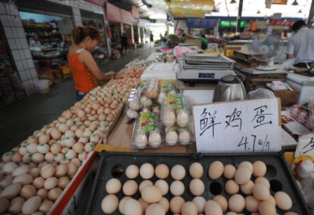 據(jù)新華社全國農(nóng)副產(chǎn)品和農(nóng)資價(jià)格行情系統(tǒng)監(jiān)測(cè)數(shù)據(jù)顯示,8月11日,普通鮮雞蛋全國日均價(jià)較7月21日價(jià)格上漲7.3%,較6月11日價(jià)格僅低0.4%。 圖為8月12日,記者在成都市一家市場(chǎng)看到,售賣價(jià)格最高的藏雞蛋為20元一斤,普通鮮雞蛋最低為4.7元一斤。