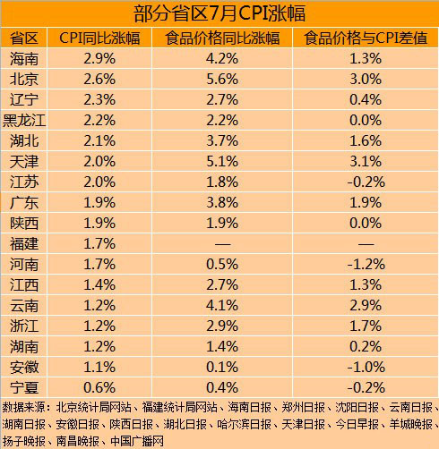 從百姓較為敏感的食品價格看,北京、天津、海南、云南、廣東、湖北、浙江、遼寧、江西等9個省(區(qū)、市)食品價格漲幅超2.4%的全國水平。排在前三位的依次是北京(5.6%)、天津(5.1%)、海南(4.2)。北京和海南7月CPI和食品價格漲幅均處于較高水平。