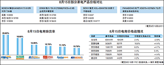 阿里巴巴旗下購物比價搜索平臺一淘網(wǎng)監(jiān)測信息顯示,“8·15”當天共監(jiān)測全網(wǎng)六大B2C商家網(wǎng)購大家電商品11.7萬余件。其中僅有5000多件商品價格有所下降,總占比僅4.2%。在宣布參加價格戰(zhàn)的商家中,國美電器官網(wǎng)的降價商品比例達到了16.6%,也是最實在最給力的商家。京東商城降價大家電的比例僅有6%。難怪有網(wǎng)友不斷隔空“喊”劉強東安排降價。