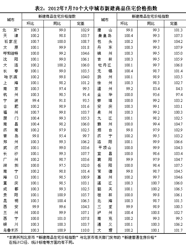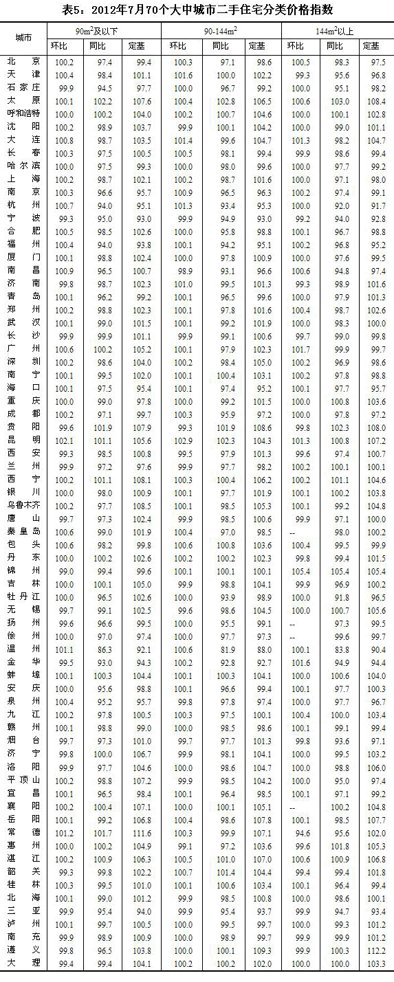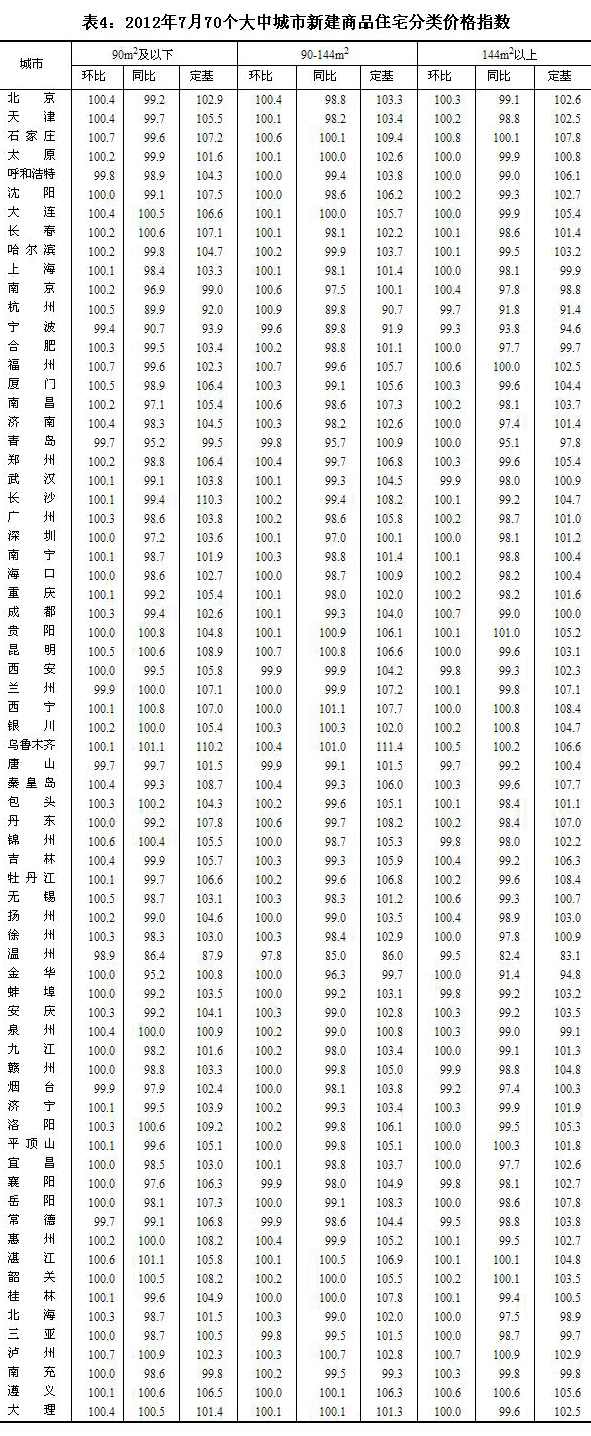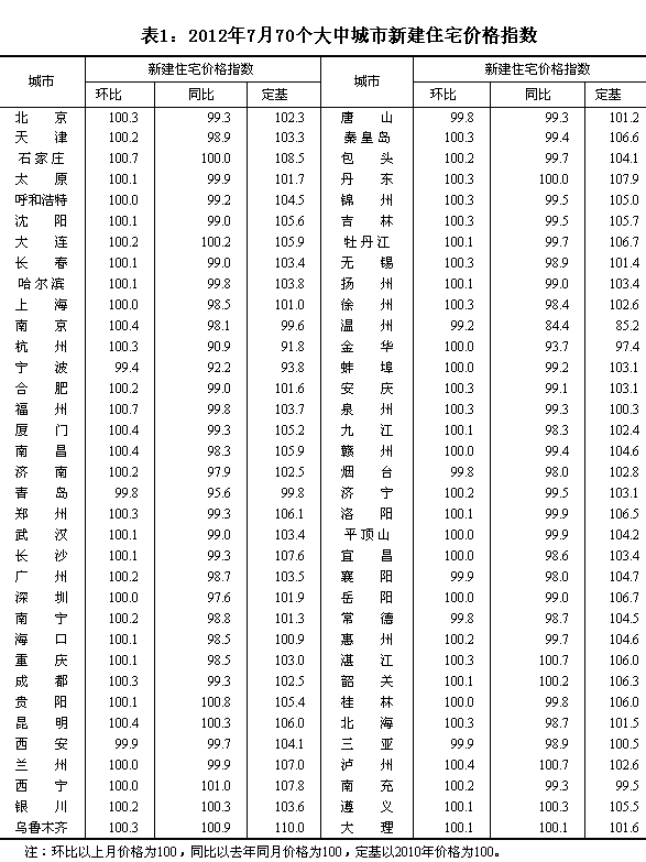 2012年7月份70個(gè)大中城市住宅銷售價(jià)格變動(dòng)情況