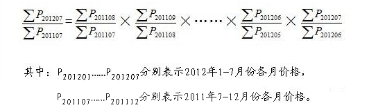 3、同比價(jià)格指數(shù)的計(jì)算方法。由于部分城市用以計(jì)算同比價(jià)格指數(shù)的基期網(wǎng)簽數(shù)據(jù)缺失,故不能計(jì)算2012年10月前各月與網(wǎng)簽數(shù)據(jù)同一口徑的同比價(jià)格指數(shù)。為保持同比價(jià)格指數(shù)計(jì)算和發(fā)布的連續(xù)性和穩(wěn)定性,滿足有關(guān)方面的需要,國家統(tǒng)計(jì)局采用有關(guān)房價(jià)統(tǒng)計(jì)數(shù)據(jù)和按網(wǎng)簽數(shù)據(jù)計(jì)算的房價(jià)數(shù)據(jù),根據(jù)同比指數(shù)和環(huán)比指數(shù)之間的數(shù)學(xué)關(guān)系,對(duì)7月份同比價(jià)格指數(shù)的計(jì)算進(jìn)行了技術(shù)處理:將2011年8—12月的環(huán)比數(shù)據(jù)連乘再乘以今年1—7月的環(huán)比數(shù)據(jù)生成本月同比價(jià)格指數(shù)。以此類推可計(jì)算其他月份的同比價(jià)格指數(shù)。計(jì)算公式表示為: