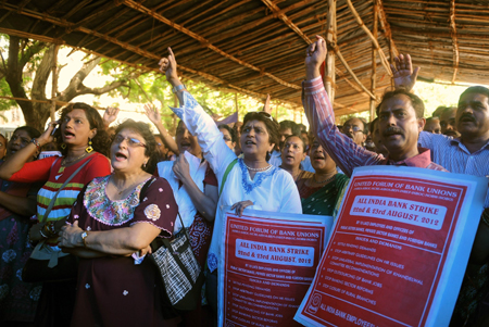 8月22日,印度孟買的銀行業(yè)員工舉行罷工游行。 印度銀行業(yè)大約100萬(wàn)職員22日開(kāi)始為期兩天的罷工,抗議印度議會(huì)可能批準(zhǔn)修改銀行法,放寬銀行業(yè)并購(gòu)限制同時(shí)允許更多私人資本進(jìn)入這一行業(yè)。