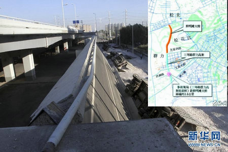 圖說:2012年8月24日哈爾濱陽明灘大橋發(fā)生垮塌,該橋建成通車至垮塌不足一年。