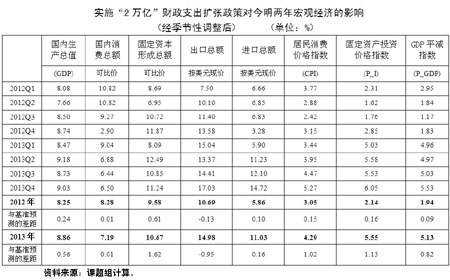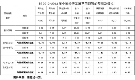 1、在各種預測及模擬情況下,經濟增長率的最低預測值為7.5%。說明中國經濟增長“降中趨穩(wěn)”的態(tài)勢正在確立。盡管由于歐元區(qū)經濟衰退的沖擊,將增大短期內中國經濟增長率進一步下滑的壓力,但是,適當的宏觀調控政策將使中國經濟不會出現大幅度下滑。7.5%的增速是近期可以實現的低線。另一方面,即使為提高增長而出臺“2萬億”的投資刺激計劃,經濟增速也僅能拉升到8.25%(2012年)和8.86%(2013年)的水平,高低區(qū)間不過0.5-0.6個百分點。