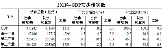 經(jīng)初步核實,2011年國內(nèi)生產(chǎn)總值現(xiàn)價總量為472882億元,比初步核算數(shù)增加1318億元,按不變價格計算的增長速度為9.3%,比初步核算數(shù)提高0.1個百分點。其中,第一產(chǎn)業(yè)增加值為47486億元,比初步核算數(shù)減少226億元,增長速度為4.3%,比初步核算降低0.2個百分點。第二產(chǎn)業(yè)增加值為220413億元,比初步核算數(shù)減少179億元,增長速度為10.3%,比初步核算數(shù)降低0.3個百分點。第三產(chǎn)業(yè)增加值為204983億元,比初步核算數(shù)增加1723億元,增長速度為9.4%,比初步核算數(shù)提高0.5個百分點。按初步核實數(shù)計算的三次產(chǎn)業(yè)結構,第一產(chǎn)業(yè)占10.0%,第二產(chǎn)業(yè)占46.6%,第三產(chǎn)業(yè)占43.4%。