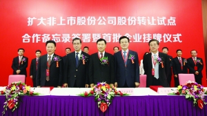 在掛牌儀式上,中國(guó)證監(jiān)會(huì)副主席姚剛與北京市常務(wù)副市長(zhǎng)李士祥、天津市常務(wù)副市長(zhǎng)崔津渡、上海市副市長(zhǎng)屠光紹和湖北省副省長(zhǎng)趙斌分別簽署合作備忘錄,來自北京中關(guān)村、天津?yàn)I海、上海張江和武漢東湖四家高新技術(shù)園區(qū)的8家公司負(fù)責(zé)人為掛牌交易共同敲鐘。