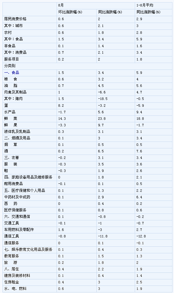 8月份,全國居民消費(fèi)價(jià)格總水平環(huán)比上漲0.6%。其中,城市上漲0.6%,農(nóng)村上漲0.6%;食品價(jià)格上漲1.5%,非食品價(jià)格上漲0.1%;消費(fèi)品價(jià)格上漲0.7%,服務(wù)項(xiàng)目價(jià)格上漲0.2%。