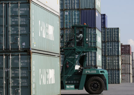 圖為一名工人在東京某工業(yè)港口集裝箱旁作業(yè)。