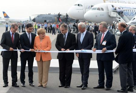 9月11日,德國總理默克爾(左三)和波蘭副總理兼經(jīng)濟部長瓦爾德馬·帕夫拉克(左四)為開幕剪彩。 當(dāng)日,2012年柏林國際航空航天展在柏林開幕。本屆航展為期6天,伙伴國為波蘭,吸引了來自46個國家和地區(qū)的1243家參展商,共有約270架各類飛行器參加靜態(tài)和動態(tài)展示。柏林航展始于1909年,是世界上歷史最悠久的航展,每兩年舉行一次。