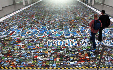 9月17日,在德國科隆,參觀者在媒體預(yù)展日走在鋪滿照片的地面上。 2012世界影像博覽會將于9月18日至23日在德國科隆舉行。來自40多個國家和地區(qū)的1200多家供應(yīng)商將參展。