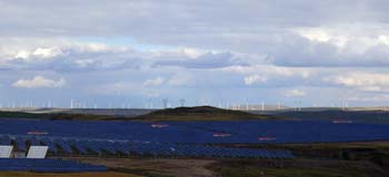一座座亭亭玉立的風力發(fā)電機,一排排熠熠生輝的太陽能光伏電池板,構成塞北高原一道奇異的風景。記者 杜躍進/攝 |