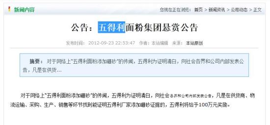 五得利集團(tuán)今日在官方網(wǎng)站上發(fā)布公告稱,對于網(wǎng)絡(luò)上“五得利面粉添加硼砂”的傳聞,五得利為證明清白,向社會各界和公司內(nèi)部發(fā)表公告,凡是在供貨商、物流運(yùn)輸、采購、生產(chǎn)、銷售等環(huán)節(jié)找到能證明五得利廠家添加硼砂證據(jù)的,五得利將給予100萬元獎(jiǎng)勵(lì)。
