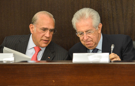 24日,經(jīng)合組織秘書長葛利亞和意大利總理蒙蒂在羅馬商討意大利的結(jié)構(gòu)改革問題。葛利亞表示,蒙蒂提出的改革必須堅持下去,不能走回頭路,這對歐元區(qū)國家至關(guān)重要。經(jīng)合組織的一份最新報告表示,政府的改革將在未來十年給意大利的GDP加上四個百分點。蒙蒂則樂觀地表示,最近一年進行改革后的意大利,不再威脅歐元區(qū)穩(wěn)定。