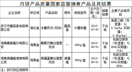 國家質(zhì)檢總局今日在其官網(wǎng)公布了2012年月餅產(chǎn)品質(zhì)量國家監(jiān)督抽查結(jié)果。結(jié)果顯示,本次共抽查320種月餅產(chǎn)品,壹品香、滿福隆等3種月餅不符合標(biāo)準(zhǔn)規(guī)定,不合格項目主要涉及脫氫乙酸、包裝空隙率項目。