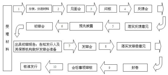 按照依法行政、公開透明、集體決策、分工制衡的要求,首次公開發(fā)行股票(以下簡稱首發(fā))的審核工作流程分為受理、見面會、問核、反饋會、預(yù)先披露、初審會、發(fā)審會、封卷、會后事項、核準發(fā)行等主要環(huán)節(jié),分別由不同處室負責,相互配合、相互制約。對每一個發(fā)行人的審核決定均通過會議以集體討論的方式提出意見,避免個人決斷。