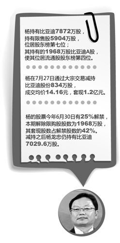 按照首發(fā)承諾,楊的股票今年6月30日將有25%解禁,本期解除限購股股數(shù)為1968萬股,其套現(xiàn)股數(shù)占解禁股數(shù)的42%。減持之后楊龍忠仍持有比亞迪7029.6萬股。