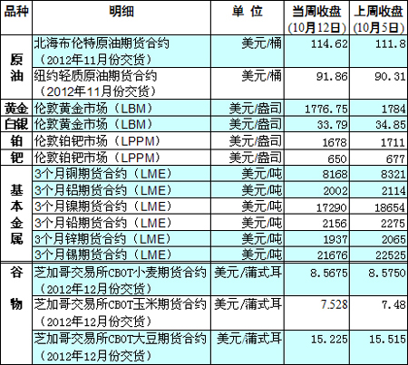 國際大宗商品期貨價格明細表[2012-10-15]