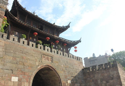 “文明門”城樓城門位于南溪城區(qū)南大街,是長江邊上迄今保存最為完整的城樓城墻,素有“萬里長江第一門”之稱,是古城南溪的象征和標(biāo)志。