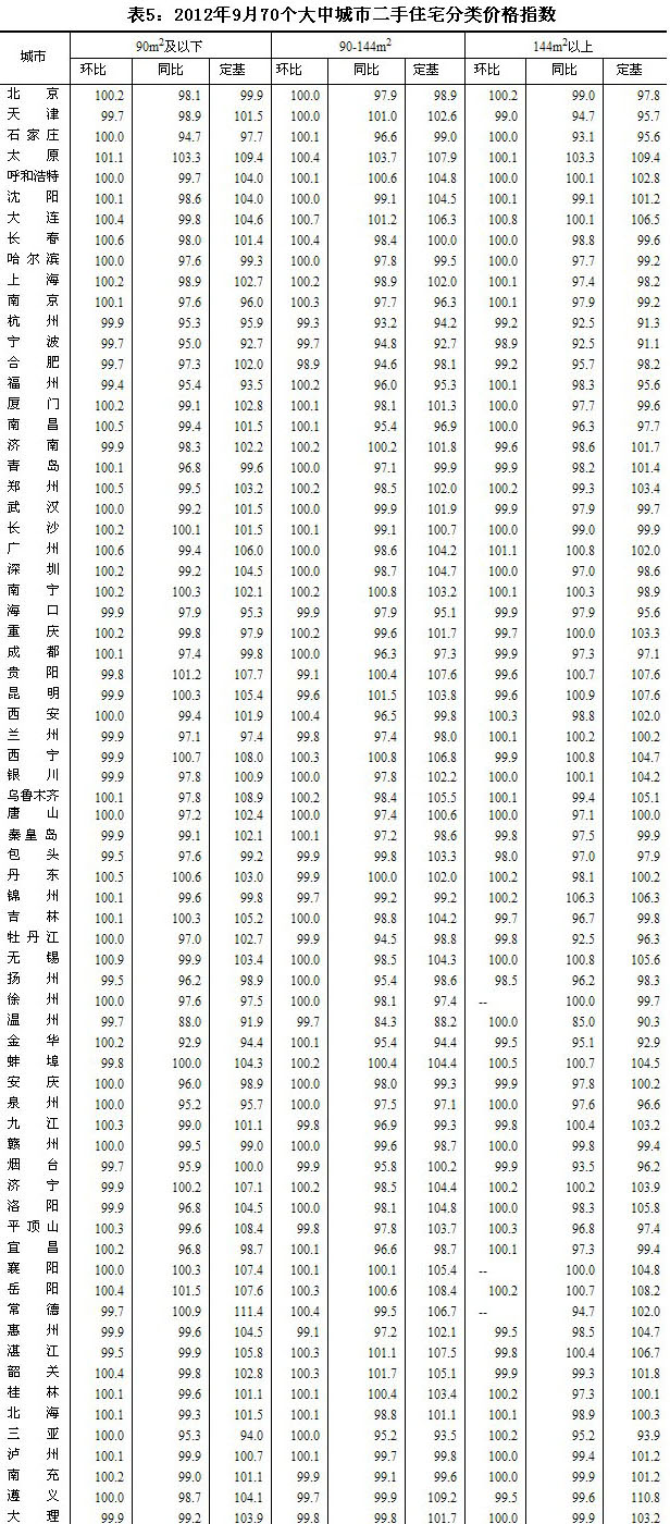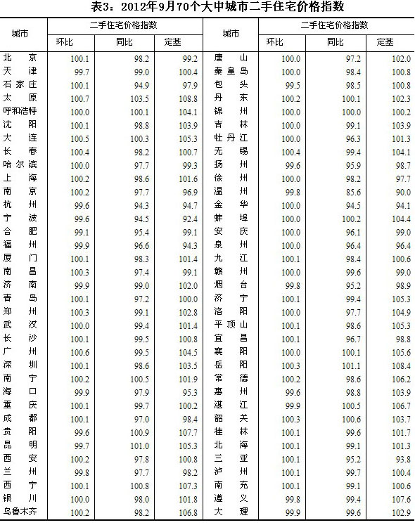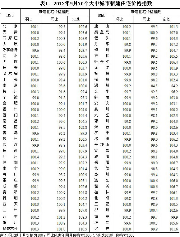 2012年9月份70個大中城市住宅銷售價格變動情況