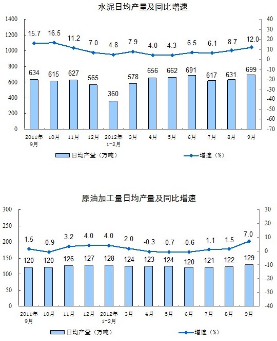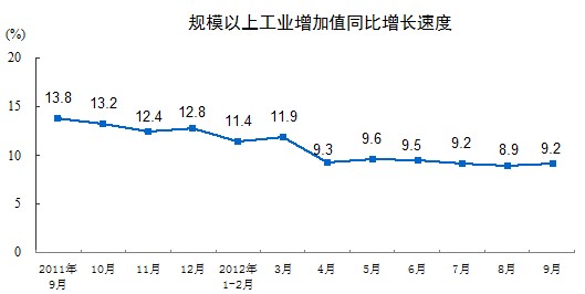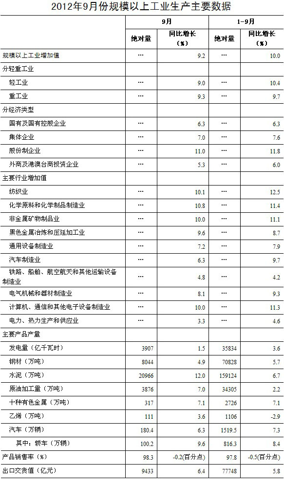 2012年9月份,規(guī)模以上工業(yè)增加值同比實際增長9.2%(以下增加值增速均為扣除價格因素的實際增長率),比8月份加快0.3個百分點。從環(huán)比看,9月份,規(guī)模以上工業(yè)增加值比上月增長0.79%。1-9月份,規(guī)模以上工業(yè)增加值同比增長10.0%。
