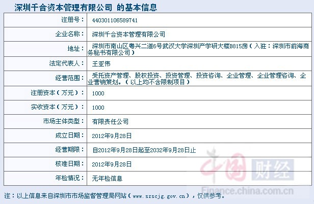 公開(kāi)信息顯示,千合資本管理有限公司成立于2012年9月28日,注冊(cè)資本1000萬(wàn)元,法人代表為王亞偉,公司地址位于深圳前海地區(qū),公司業(yè)務(wù)主要是受托資產(chǎn)管理、股權(quán)投資、投資管理、投資咨詢、企業(yè)管理、企業(yè)管理咨詢、企業(yè)營(yíng)銷策劃。