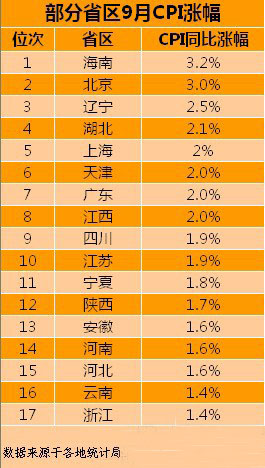 根據(jù)各地公布的數(shù)據(jù),中新網(wǎng)財(cái)經(jīng)頻道統(tǒng)計(jì)發(fā)現(xiàn),截至22日,海南、北京、遼寧、湖北、上海、天津、廣東、江西、四川、江蘇、寧夏、陜西、安徽、河南、河北、云南、浙江這17個(gè)省(區(qū)、市)公布了9月份CPI數(shù)據(jù)。