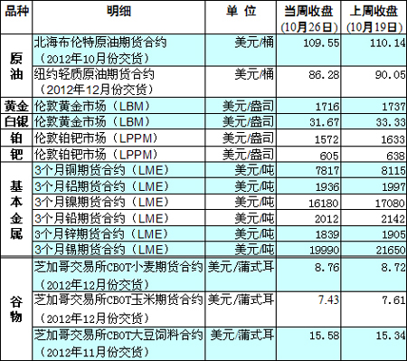 國際大宗商品期貨價(jià)格明細(xì)表[2012-10-29]