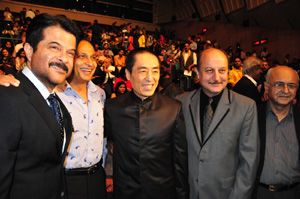 中國(guó)導(dǎo)演張藝謀(中)與印度男演員等合影。記者 趙旭/攝 |
