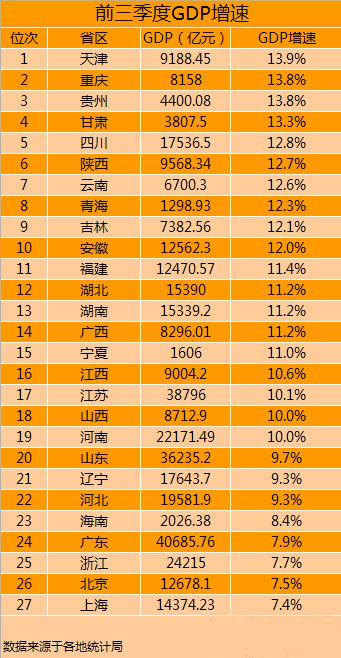 根據(jù)各地公布的數(shù)據(jù),中新網(wǎng)財(cái)經(jīng)頻道統(tǒng)計(jì)發(fā)現(xiàn),在已經(jīng)公布的這27個(gè)省份中,天津以13.9%的增速居首,重慶(13.8%)和貴州(13.8%)并列第二,而上海增速墊底,僅為7.4%。