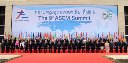 國務(wù)院總理溫家寶5日在老撾萬象出席第九屆亞歐首腦會議第一次領(lǐng)導(dǎo)人會議,并作了題為《共同擔(dān)負起促進世界經(jīng)濟穩(wěn)定增長的重任》的主旨發(fā)言。