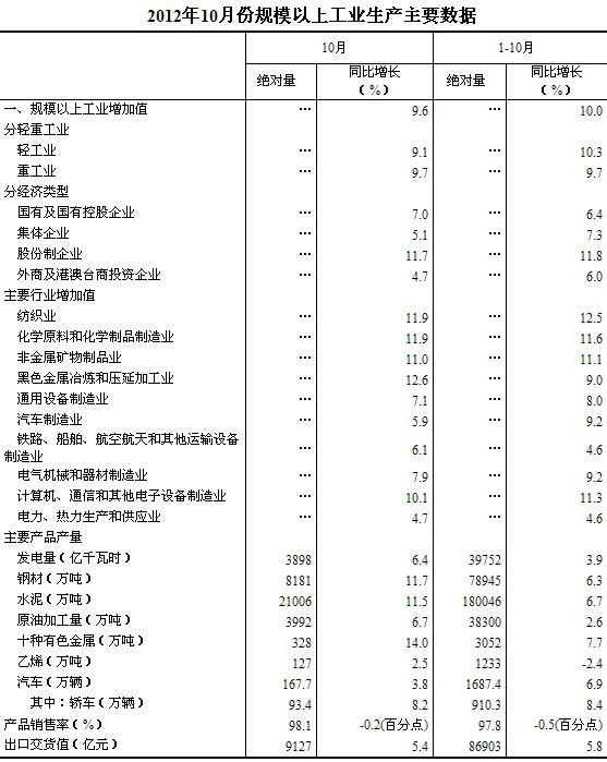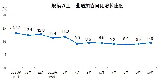 2012年10月份,規(guī)模以上工業(yè)增加值同比實(shí)際增長(zhǎng)9.6