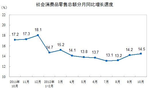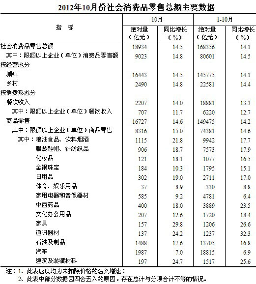 2012年10月份,社會(huì)消費(fèi)品零售總額18934億元,同比名義增長(zhǎng)14.5%(扣除價(jià)格因素實(shí)際增長(zhǎng)13.5%,以下除特殊說(shuō)明外均為名義增長(zhǎng))。其中,限額以上企業(yè)(單位)消費(fèi)品零售額9023億元,增長(zhǎng)14.8%。1-10月份,社會(huì)消費(fèi)品零售總額168356億元,同比名義增長(zhǎng)14.1%(扣除價(jià)格因素實(shí)際增長(zhǎng)11.8%)。從環(huán)比看,10月份社會(huì)消費(fèi)品零售總額增長(zhǎng)1.34%。