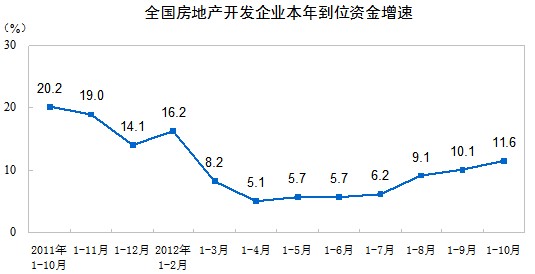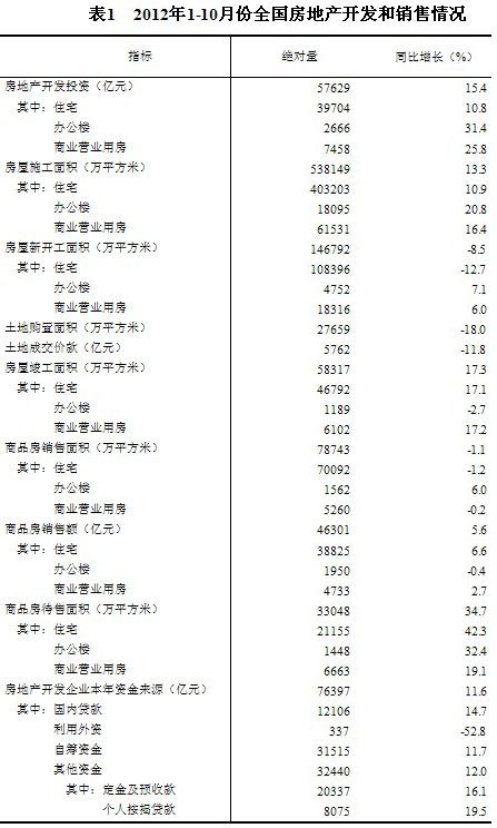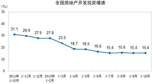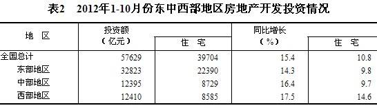 2012年1-10月份,全國房地產(chǎn)開發(fā)投資57629億元,同比名義增長15.4%,增速與1-9月份持平。其中,住宅投資39704億元,增長10.8%,增速提高0.3個(gè)百分點(diǎn),占房地產(chǎn)開發(fā)投資的比重為68.9%。