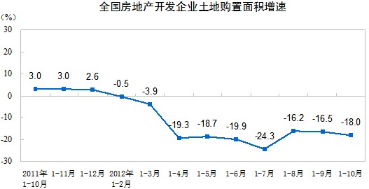 1-10月份,房地產(chǎn)開發(fā)企業(yè)土地購置面積27659萬平方米,同比下降18.0%,降幅比1-9月份擴(kuò)大1.5個(gè)百分點(diǎn);土地成交價(jià)款5762億元,下降11.8%,降幅擴(kuò)大0.8個(gè)百分點(diǎn)。