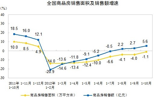 1-10月份,商品房銷售面積78743萬平方米,同比下降1.1%,降幅比1-9月份縮小2.9個(gè)百分點(diǎn);其中,住宅銷售面積下降1.2%,辦公樓銷售面積增長6.0%,商業(yè)營業(yè)用房銷售面積下降0.2%。商品房銷售額46301億元,增長5.6%,增速比1-9月份提高2.9個(gè)百分點(diǎn);其中,住宅銷售額增長6.6%,辦公樓銷售額下降0.4%,商業(yè)營業(yè)用房銷售額增長2.7%。