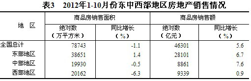 1-10月份,東部地區(qū)商品房銷售面積38651萬平方米,同比增長1.4%,1-9月份為下降2.3%;銷售額28101億元,增長6.7%,增速提高3.6個(gè)百分點(diǎn)。中部地區(qū)商品房銷售面積19930萬平方米,下降0.5%,降幅縮小1.6個(gè)百分點(diǎn);銷售額8861億元,增長7.6%,增速提高1.6個(gè)百分點(diǎn)。西部地區(qū)商品房銷售面積20162萬平方米,下降6.3%,降幅縮小2.5個(gè)百分點(diǎn);銷售額9339億元,增長0.9%,1-9月份為下降1.6%。