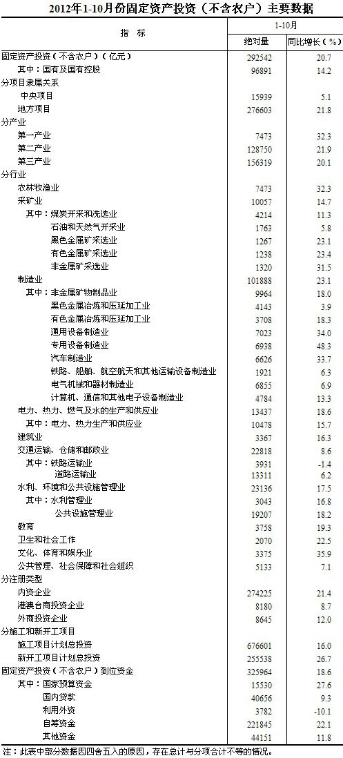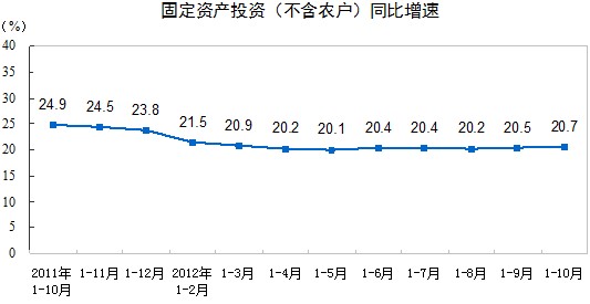 2012年1-10月份,全國(guó)固定資產(chǎn)投資(不含農(nóng)戶)292542億元,同比名義增長(zhǎng)20.7%,增速比1-9月份加快0.2個(gè)百分點(diǎn)。從環(huán)比看,10月份固定資產(chǎn)投資(不含農(nóng)戶)增長(zhǎng)1.94%。